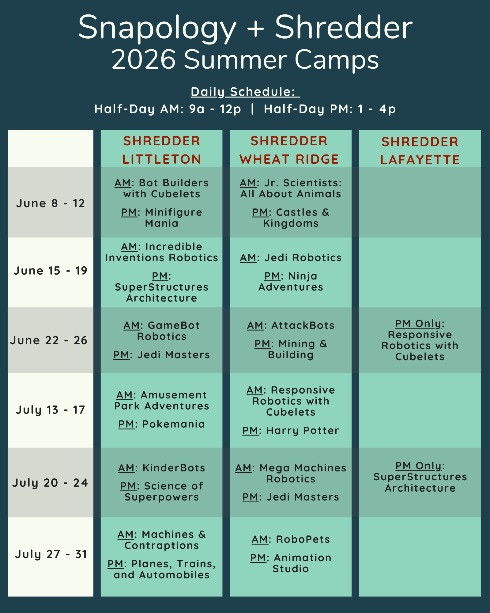 Combine a half-day Snapology with a Half-Day Shredder for a FULL DAY of FUN!